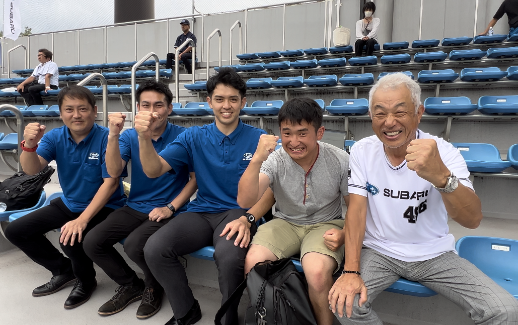 SUBARU勝ち越しにガッツポーズで喜ぶ小林達朗後援会長(右)たち