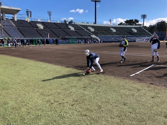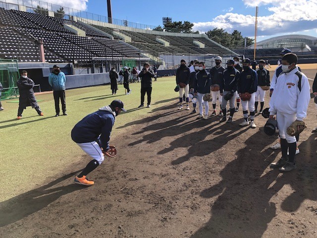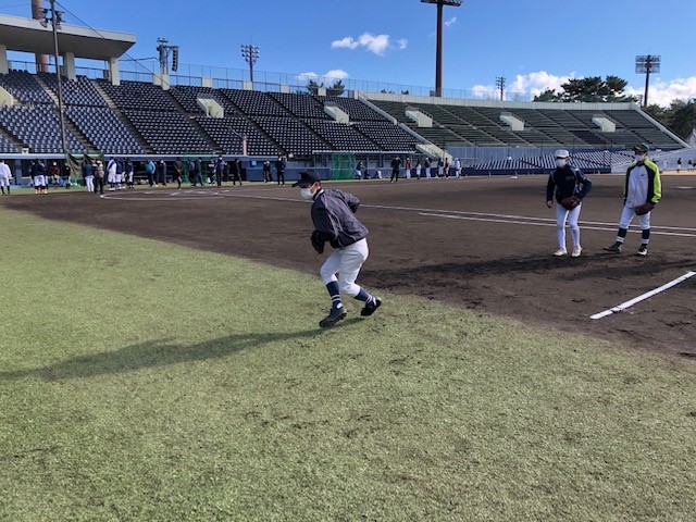 寒い中、キャッチボール、ポジション別指導、シートノック、ベースランニング、バッティング指導を行いました。