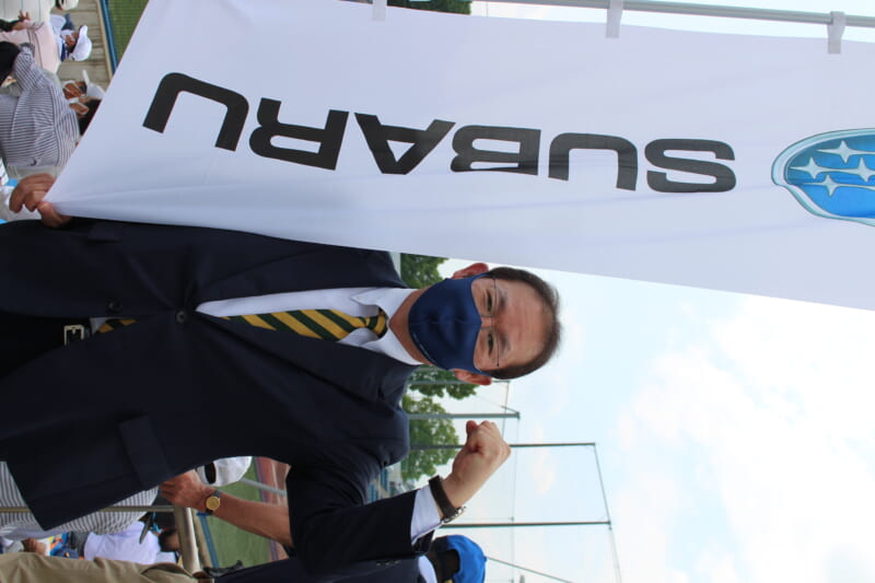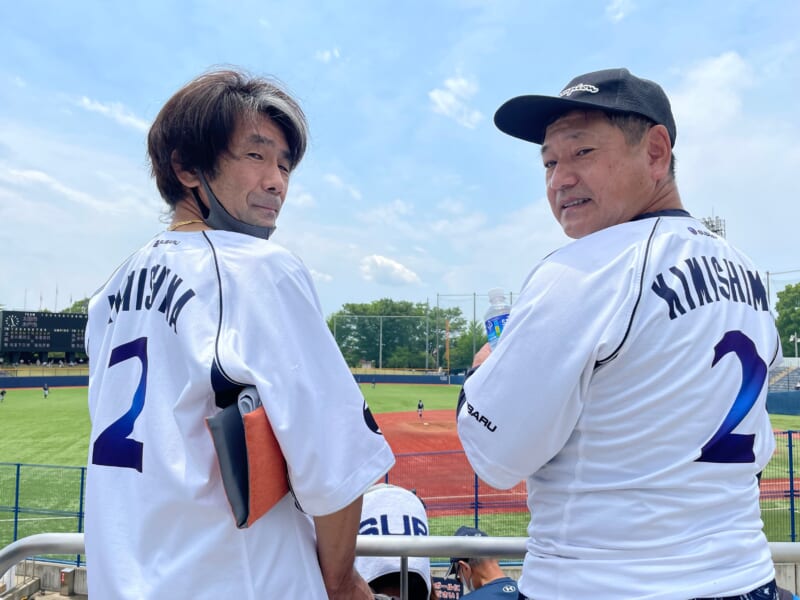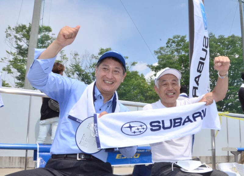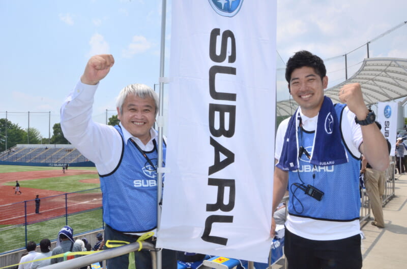 小林達朗後援会長(写真右)は「きょうは打線もいい当たりをしており、大勢の人が集まってくれて雰囲気も最高だ。これがSUBARUの野球です」と笑顔。