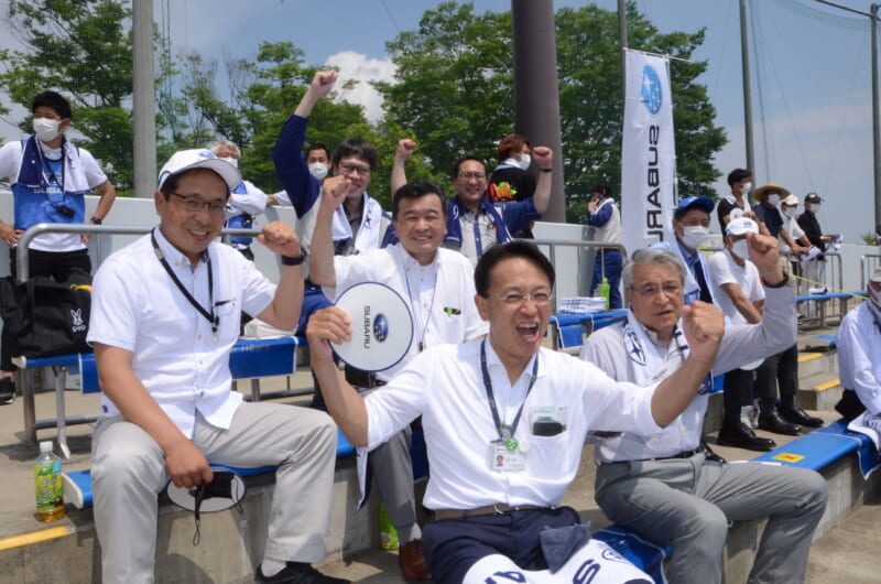 この日、SUBARUは先制点をあげ、その後も終始リード。大崎篤運動部長(写真左)は「地元・太田でこれほどの大応援団の後押しを受けながら野球ができる選手たちは幸せだ。その喜びをかみしめながら、このまま3連勝してほしい」と激励。