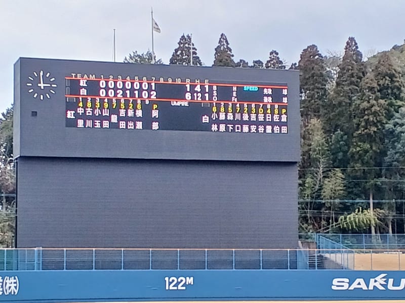 7回、劣勢の紅組は山田選手がライト線を大きく破るタイムリーで1点を返しますが、その裏に白組が2点を追加し、ゲームセット(7回で終了)となりました。