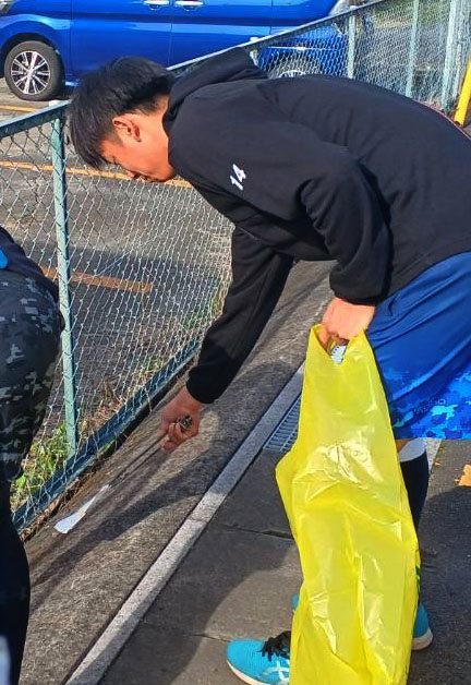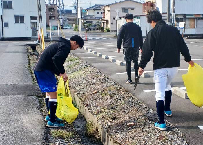 冨村優希監督の「お世話になっている地域に恩返しをしていこう」という呼びかけで、5年前から定期的に実施。今回は、練習前の朝8:00すぎに集合し、ペットボトルや空き缶、たばこの吸い殻などを拾ってゴミ袋に入れていきました。