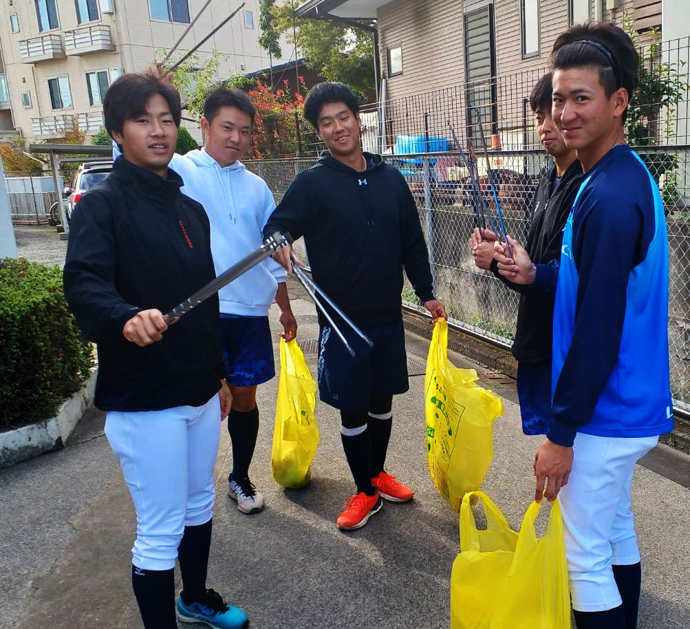 率先してゴミを拾っていた新人たち(左から、横瀬辰樹選手、海老根優大選手、吉田晃誠選手、小澤颯太投手、藤原龍之介選手)