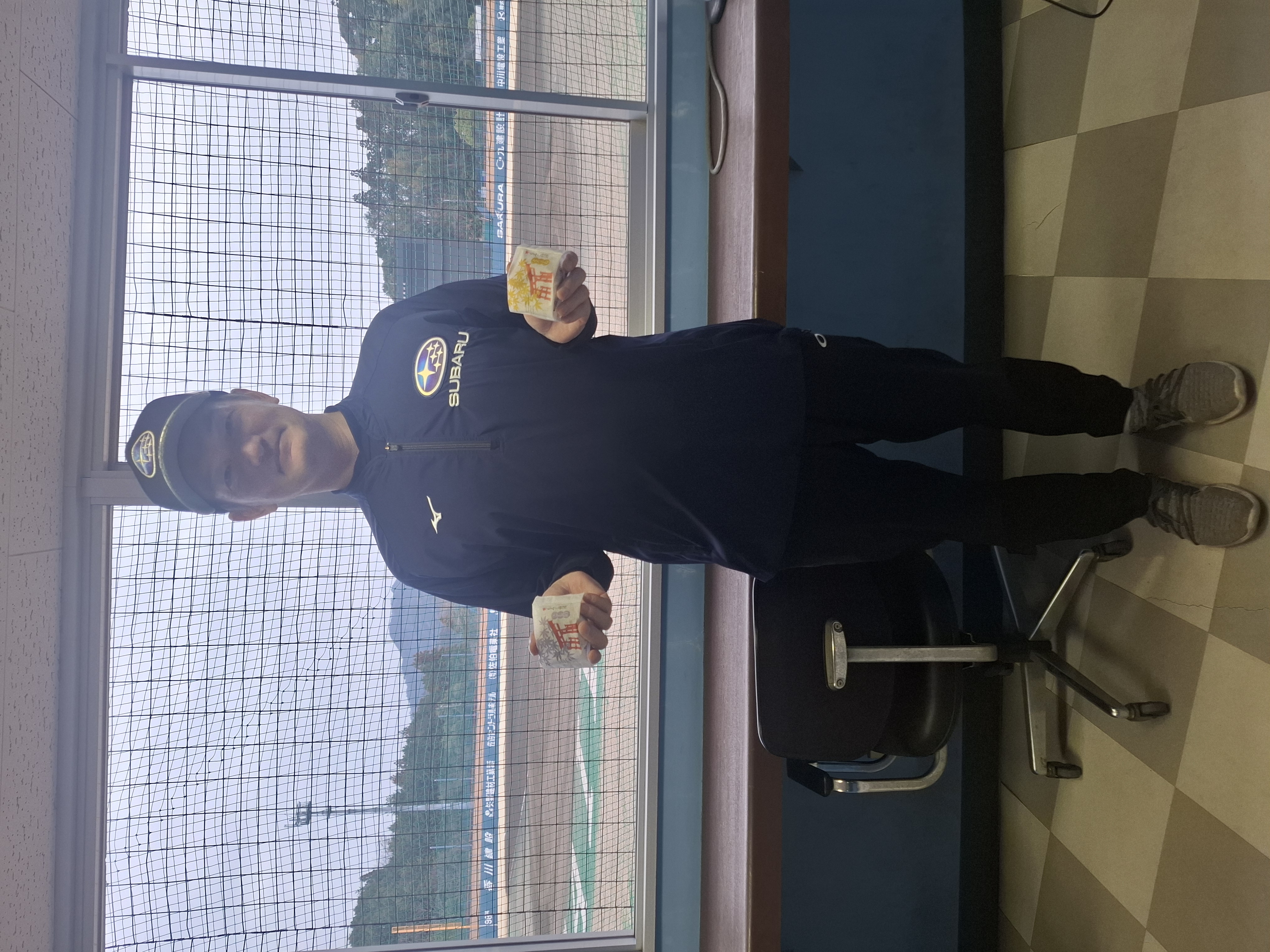 【OBの鈴木さんから選手へ、もみじ饅頭のお土産をいただきました】